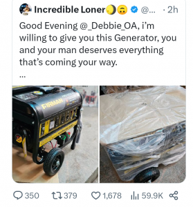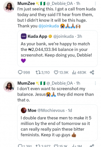 Kuda Bank joined the merry party by adding ₦2 000 000 to her already robust account balance.  The Nigerian National Petroleum Corporation (NNPC) Ltd. was not to be left out. The oil firm tweeted: “Hello @_Debbie_OA, we love your amazing love story. And we would like to gift you a free ₦200,000 PMS voucher. (It is) redeemable at any of our 900+ retail stations nationwide.”