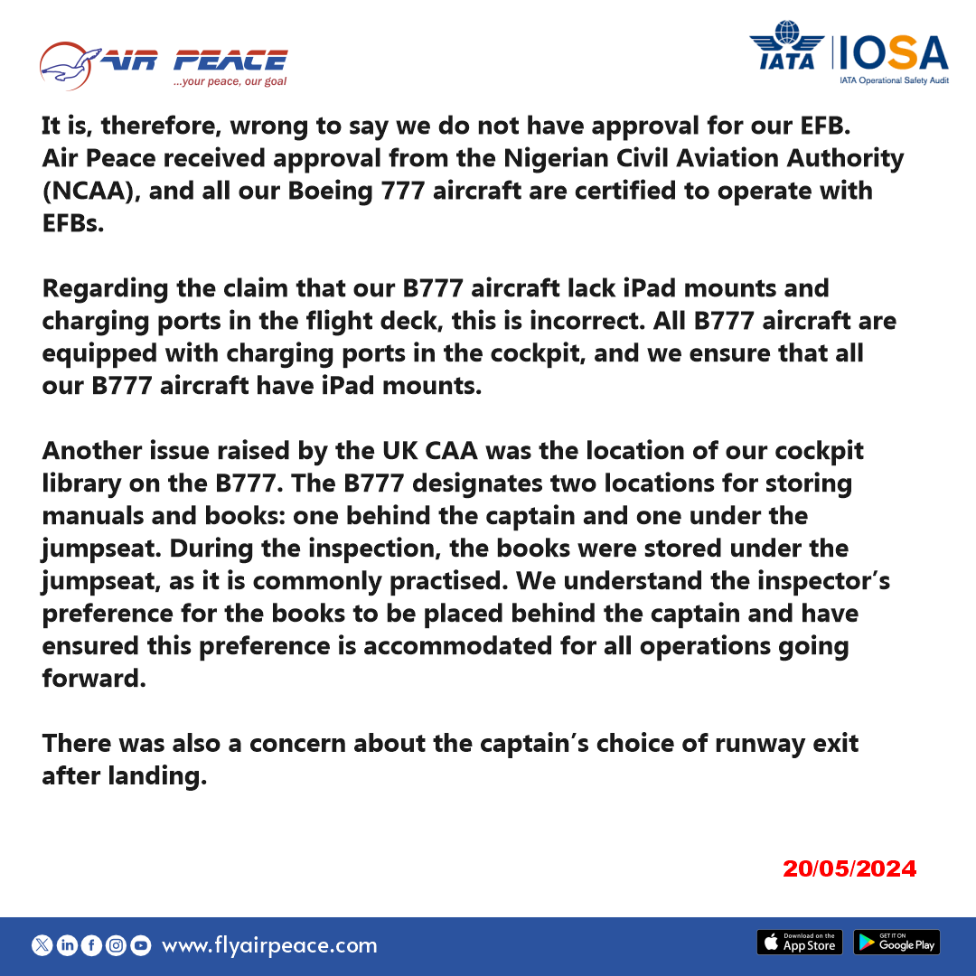 The UK CAA had requested clarifications regarding using the Electronic Flight Bag (EFB) and other operational aspects, which were provided without issues. Air Peace emphasised that all Boeing 777 aircraft have charging ports and iPad mounts, contrary to the claims of deficiencies.