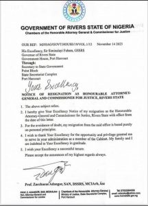 The Attorney General, who doubles as the Commissioner for Justice in Rivers State, Professor Zaccheus Adangor, has officially tendered his resignation to the state government. He stated in the letter that his resignation was for personal reasons.