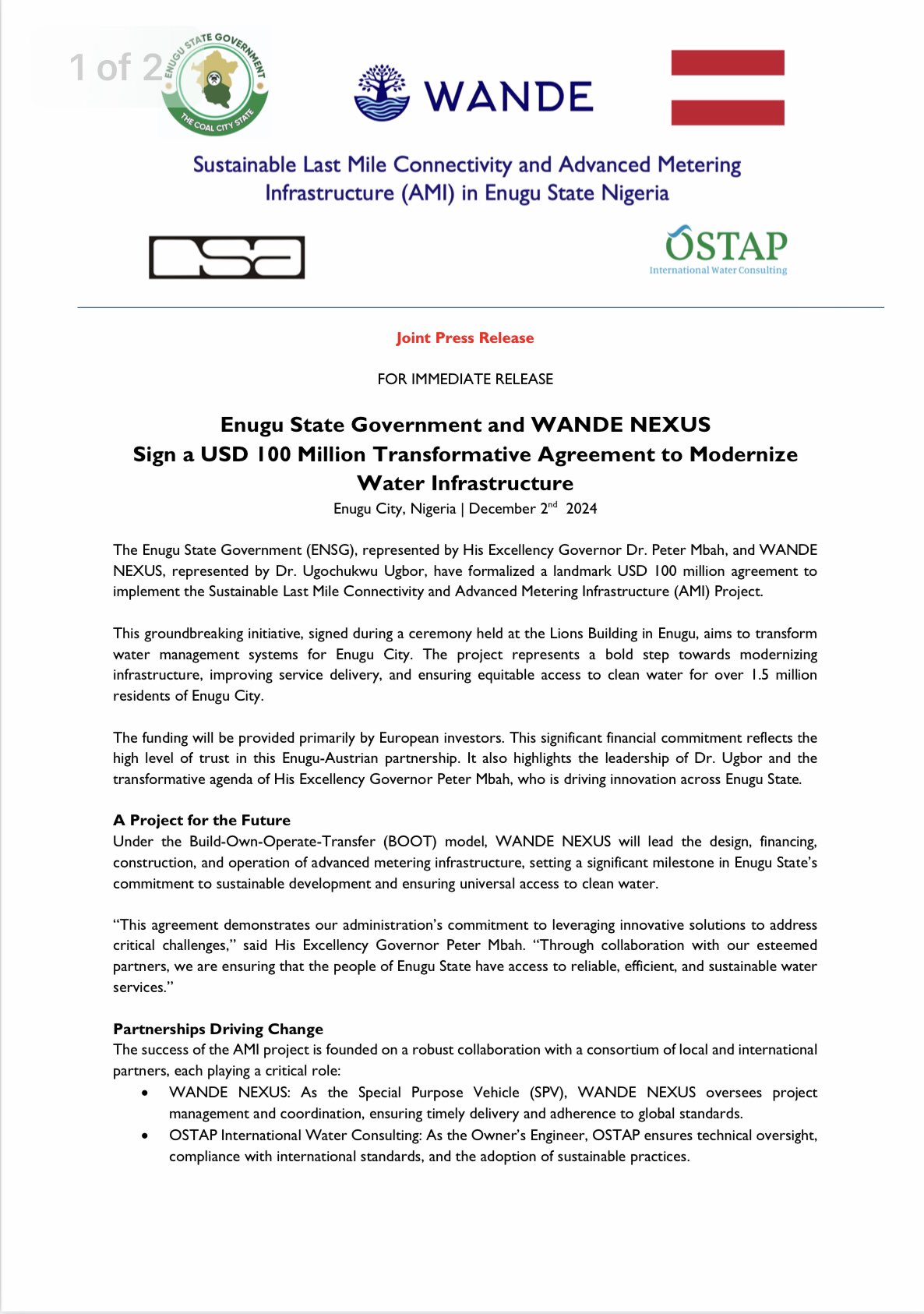 On Monday, December 2, 2024, Governor Peter Mbah of Enugu State announced a $100 million (₦168.7 billion) foreign direct investment in water infrastructure. The project is expected to benefit over 1.5 million residents of Enugu City. It reportedly involves partnerships with Wande Nexus, Ostap International Water Consulting—an Austrian firm—and Nwankwo Scott & Associates (NSA).