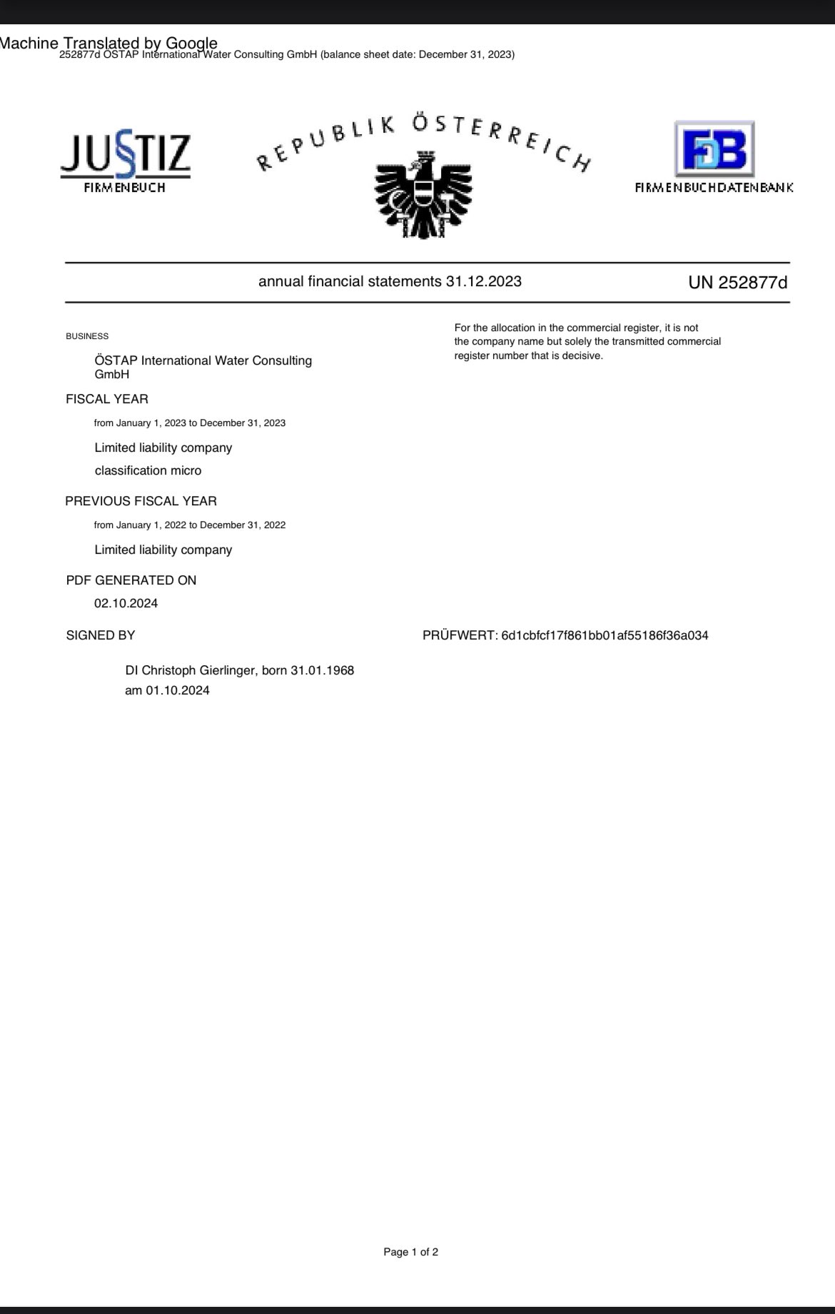 Ostap International Water Consulting, also known as ÖSTAP Engineering & Consulting GmbH, was named as another critical partner in the AMI project. Austrian investor DI Christoph Gierlinger chairs the firm and specialises in urban water and waste management. Ostap claims to have been in operation since 1971 but was certified by TÜV Austria in 2019,