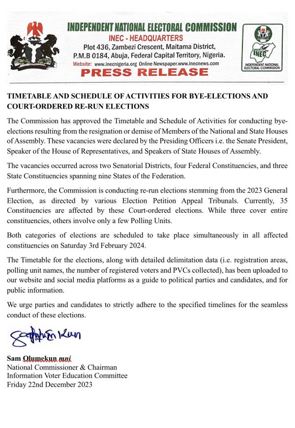 ByJoy ChukwuDecember 23, 2023In a statement signed by the INEC National Commissioner and Chairman of the Information Voter Education Committee, Sam Olumekun, on Friday, December 22,...