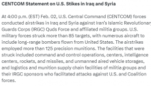 At 4:00 p.m. (EST) Feb. 02, U.S. Central Command (CENTCOM) forces conducted airstrikes in Iraq and Syria against Iran’s Islamic Revolutionary Guards Corps (IRGC) Quds Force and affiliated militia groups. U.S. military forces… pic.twitter.com/HeLMFDx9zY