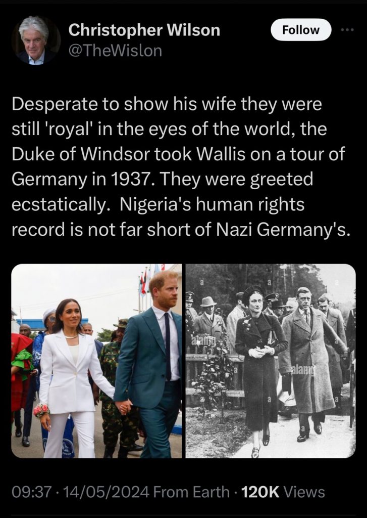 However, following Prince and Meghan Harry’s return to the United Kingdom, British media, including Good Morning Britain and Journalist Christopher Wilson, described Nigeria’s human rights records in a now-deleted post on X (formerly Twitter) as “Not far short of Nazi Germany’s.”