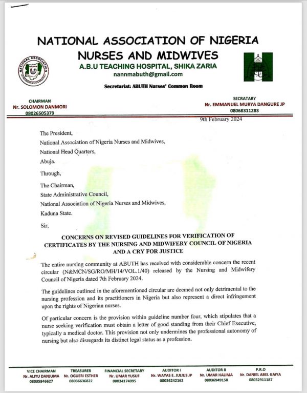 ByJoy ChukwuFebruary 10, 2024The National Association of Nigeria Nurses and Midwives, in Ahmadu Bello University Teaching Hospital (ABUTH) Zaria, has expressed concerns regarding the revised verification guidelines...