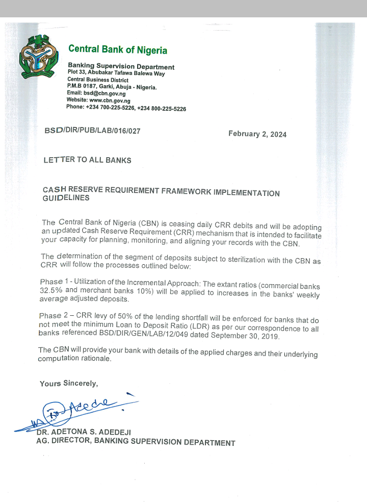 “CBN Adopts New CRR Mechanism, Halts Daily Debits for Banks”…
