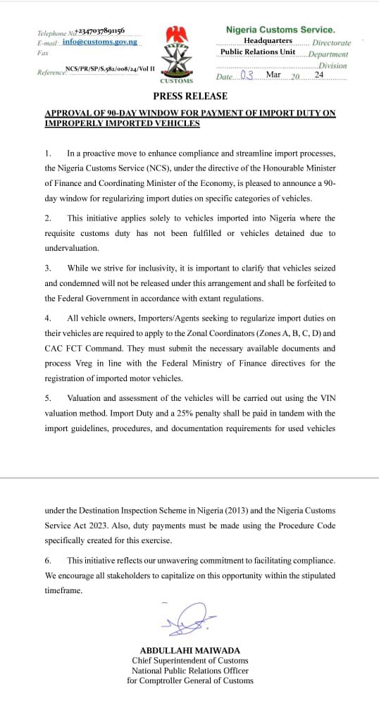 The Nigeria Customs Service (NCS) has introduced a 90-day window to regularise import duties on specific vehicle categories. This was conveyed through a recent press release signed by Abdullahi Maiwada, Chief Superintendent of Customs and National Public Relations.