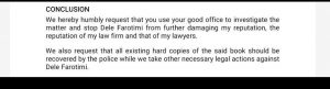 According to reports, Afe Babalola is requesting all existing hard copies of Dele Farotimi’s book to be recovered by the Police and confiscated.