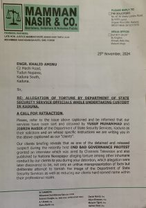 In a letter dated November 25, 2024, and addressed to one of the accused, Engr. Khalid Aminu, the law firm Mamman Nasir & Co., acting on behalf of DSS officials Yusuf Muhammad and Jibrin Nasir, demanded a public retraction of statements made by the protesters.