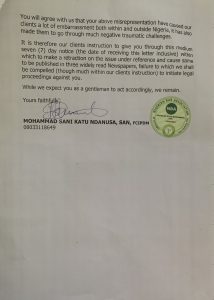 The letter stated that their clients have endured “negative traumatic challenges” as a result of the claims. The law firm issued a seven-day ultimatum for Khalid Aminu to issue a public retraction of the statements in question and ensure the retraction is published in three widely read newspapers.