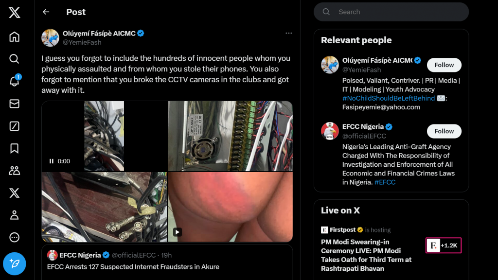 Fasipe disclosed this on his official X handle, following the night raid conducted by EFCC operatives of Ibadan Zonal Directorate, who, on “credible intelligence,” simultaneously raided an alleged “Yahoo Party” at Signature and Abah Clubs on Saturday, June 8, 2024, in Akure, Ondo State.