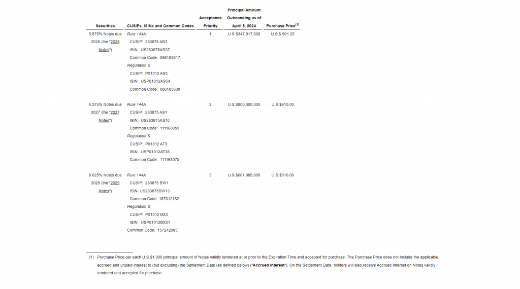 Meanwhile, the screenshot above shows the financial terms for the invitation, as El Salvador invites holders to tender its 2025, 2027, and 2029 notes for cash.
