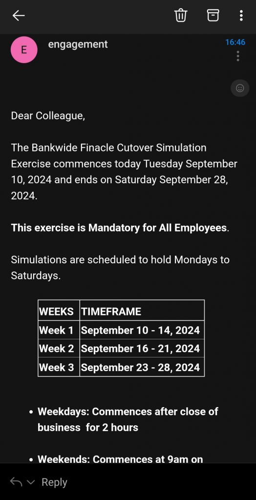 The bank is callous, tyrannical and unempathetic towards its own staff. Just today, they issued another order for all staff to wait behind after work till 7 pm for more of this ‘training’ completely disregarding the safety of those employees who live far away (some as far as Ogun state) and many live in areas unsafe after nightfall, yet the bank issued this order and had it done with immediate effect and it will be for a period of another three weeks,” the insider reported.