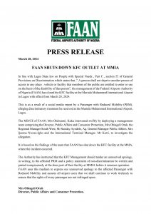 FAAN responded swiftly to his complaint, and a team was dispatched to investigate the allegations. Based on their findings, the decision was made to shut down the outlet. FAAN has additionally mandated that KFC management formally apologise to Mr Daniel and implement a written policy of non-discrimination to be displayed at the restaurant’s entrance before it is reopened.
