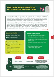 Both categories of elections are scheduled to take place simultaneously in all affected constituencies on Saturday, February 3, 2024, and the timetable for the elections, along with detailed delimitation data, has been uploaded to the INEC website and social media platforms as a guide to political parties and candidates, and for public information.