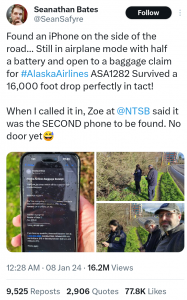 iPhone and Door Plug that Blew Out of an Alaska Plane Flight Mid-Air has been Found