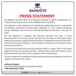 In a press statement issued on Sunday, September 15, 2024, the refinery described the statement by NNPCL spokesperson Olufemi Soneye as “misleading and mischievous.”