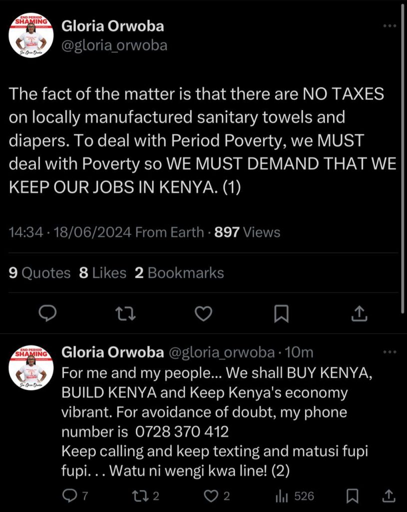 Under Wabwire’s post, his followers relayed screenshots of direct messages exchanged with Senator Orwoba, most of which indicate a demand for her support on the contentious Finance Bill, despite being an advocate for girl-child pads, which is now included in the Bill to be taxed.