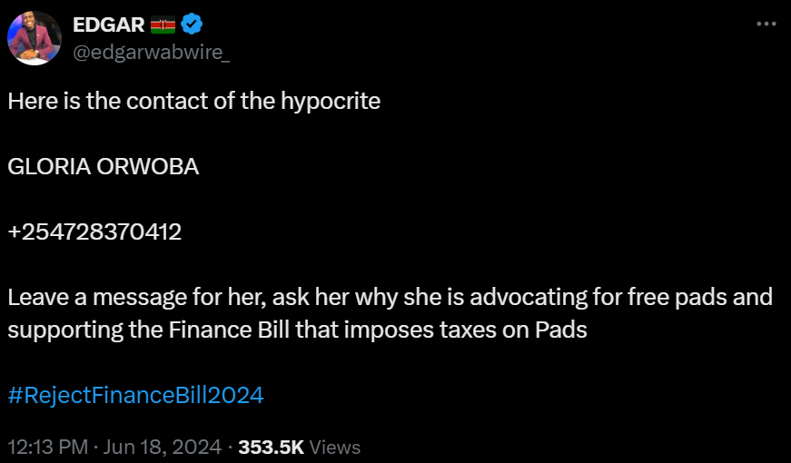 Wabwire posted the number during Tuesday’s protest, which Kenyans took to reaching out to demand answers on why she supported the Finance Bill 2024.