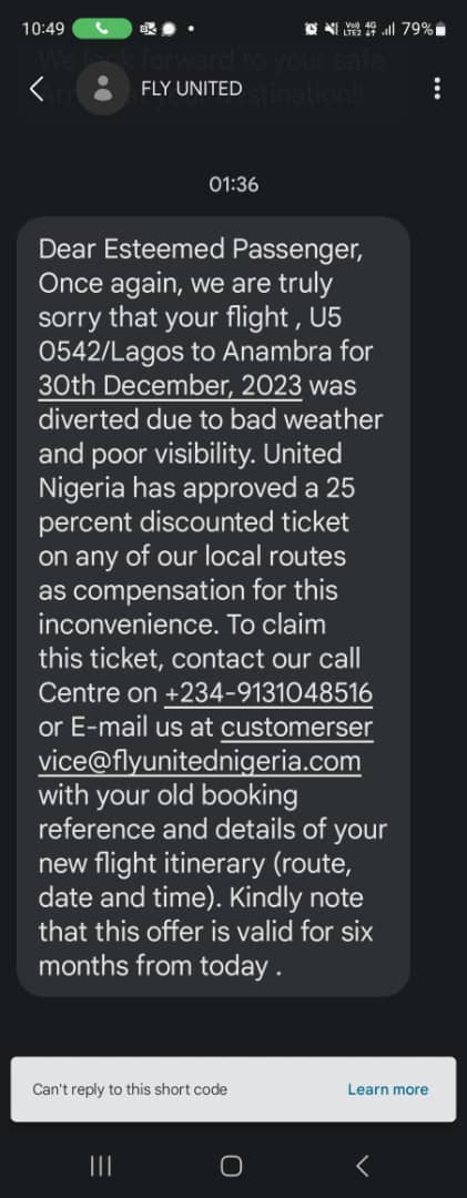 The airline, however, sent messages to the affected passengers apologizing for the ANA/ABB diversion, which it -yet again!- attributed to bad weather conditions (once more). The promise of a 25% discount was included in the text, which @9jaDisciple disclosed in a subsequent post.