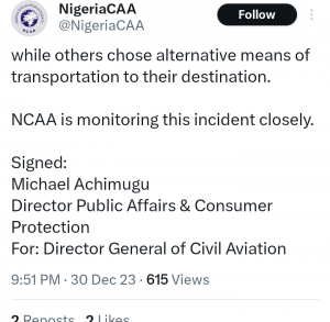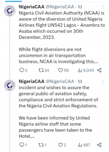 The post reads, “Nigeria Civil Aviation Authority (NCAA) is aware of the diversion of United Nigeria Airlines flight UN542 Lagos – Anambra to Asaba which occurred on 30th December 2023.”
