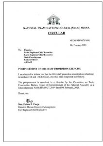 The National Examination Council, NECO, has indefinitely postponed the 2024 promotional exams, which were scheduled to take place in Minna, Niger State on 14 and 15 February.