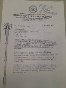 “The committee directs NECO to halt the planned, scheduled examinations indefinitely and urgently make an announcement postponement on print and electronic media. Evidence of compliance should be forwarded to the office of the chairman in suite 0.59 House of Representatives no later than Monday, 12 February 2024.