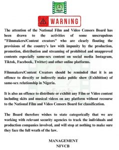 Filmmakers and content creators should be reminded that it is an offence to directly or indirectly make public show (exhibition) of same-sex relationships in Nigeria,” the statement read.