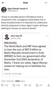 This follows a circulating post which has also been denied by Simon Ekpa, a prominent pro-Biafra activist that the World Bank and the International Monetary Fund (IMF) had agreed to loan $57.5 billion to the BRGIE, with Okonjo-Iweala supposedly playing a role in securing the funds.