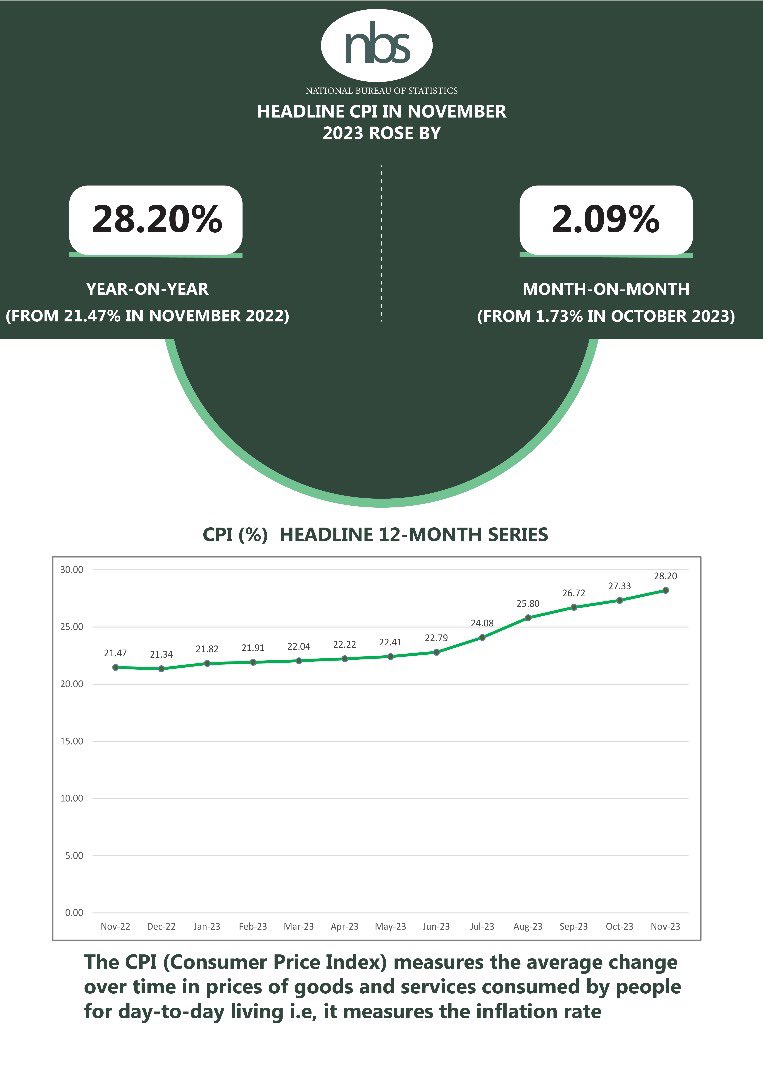 Nigeria’s economic landscape faced an intensified challenge as November 2023 witnessed a surge in headline inflation, reaching a staggering 28.20%.