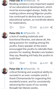 Chimamanda has once again proven that her pen is a beacon illuminating the path to a richer, more vibrant literary landscape for generations to come. In his tweet, Obi particularly applauds this while reiterating some of his dreams for a new Nigeria.