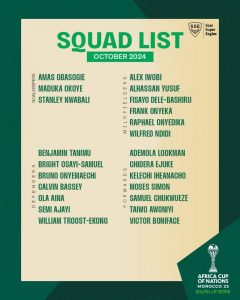 The squad includes several regulars, including team captain William Troost-Ekong, Wilfred Ndidi, Moses Simon, Alex Iwobi, and Stanley Nwabali.
