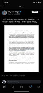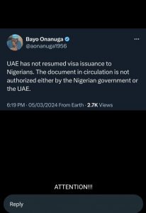 Yesterday, March 5, 2024, a viral announcement claimed that the UAE had lifted the visa ban on Nigerians. This time, the announcement was posted on the official X page of the Special Adviser to President Bola Tinubu on Information, Bayo Onanuga.