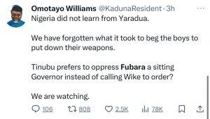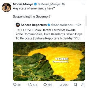 Tinubu suspending Fubara as Governor is totally wild, the police and security forces should have arrested the situation. There are whole LGs controlled by terrorists. Why have the Governors not been sacked there? A sad day, @Morris_Monye wrote.