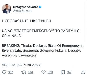 President Bola Tinubu’s declaration of a six-month state of emergency in Rivers State has sparked intense reactions, with opposition leaders, legal experts, and citizens condemning the move as unconstitutional and politically motivated.