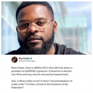 President Tinubu has no constitutional authority or power to suspend the Governor of Rivers State and the members of the Rivers State House of Assembly, Effiong wrote on X.