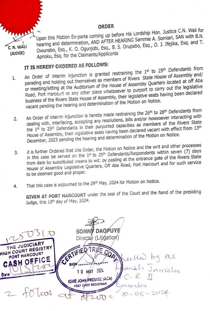 All are barred from meeting or sitting at the Auditorium of the House of Assembly Quarters, Aba Road, Port Harcourt, and their legislative seats have been declared vacant pending the hearing and determination of the Motion on Notice.