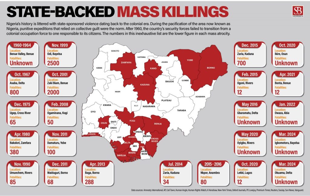 The SMB’s graphical depiction of the facts regarding state-sponsored violence encompasses approximately 23 states in Nigeria that have experienced civil unrest and mass killings, with many of them still awaiting justice.