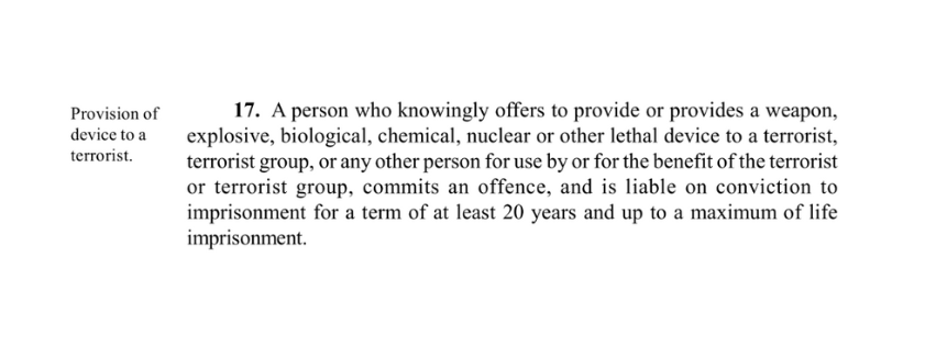 Under the Act, aiding and abetting or, as stipulated in Section 17 of the law, providing a device to a terrorist attracts a 20-year jail term or up to a maximum life imprisonment.