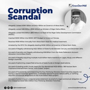 Akpabio has been accused of looting billions of naira, illegally withdrawing state funds, and mismanaging key public projects. During his tenure as Governor, he allegedly siphoned public funds into private ventures, including the controversial Four Points by Sheraton hotel project, which lacked a proper franchise agreement. Investigators also claim he played a key role in inflating national budgets to funnel money into personal and political interests.