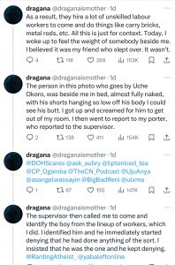 I woke up to feel the weight of somebody beside me. I believed it was my friend who slept over. It wasn’t. The person in this photo, who goes by Uche Okoro, was beside me in bed, almost fully naked, with his shorts hanging so low off his body I could see his butt, Ganiyu wrote in her post.