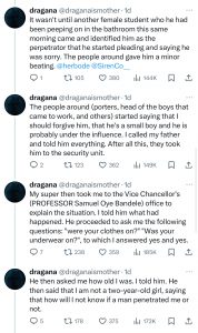 Despite this admission, the response of the university’s management has sparked widespread outrage. Ganiyu revealed that after reporting the matter to the school’s porters and the security unit, she was taken to the office of the Vice-Chancellor, Professor Samuel Oye Bandele.
