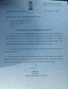 President Bola Tinubu has approved a 12-month extension of service for Comptroller MT Awe and other top officials of the Nigeria Customs Service (NCS), despite concerns over brewing scandal within the agency regarding delayed retirements and lobbying for service extensions.