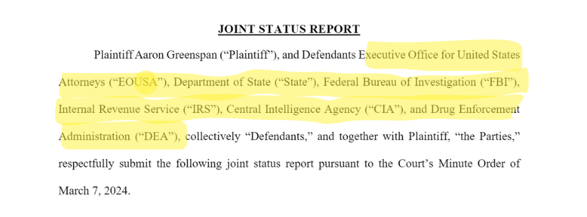 The Plaintiff, (Mr Greenspan) had stated in his filing that the schedule of document disclosures under the September 2023 JSR was not fully complied with by the FBI, State Department, DEA and IRS. Consequently, he filed an ‘Amended Compliant‘ against the Defendants (see highlighted screenshot below) on March 24, 2024.