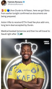 Meanwhile, Aston Villa’s Colombian forward Jhon Durán is set to move to Al Nassr. The deal has been finalised, with the Saudi Pro League club agreeing to pay a €77 million fixed fee plus add-ons.