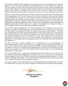 They also accused the TCN management of deploying military personnel to intimidate and harass workers, warning that any injury inflicted on workers would be the TCN’s responsibility.