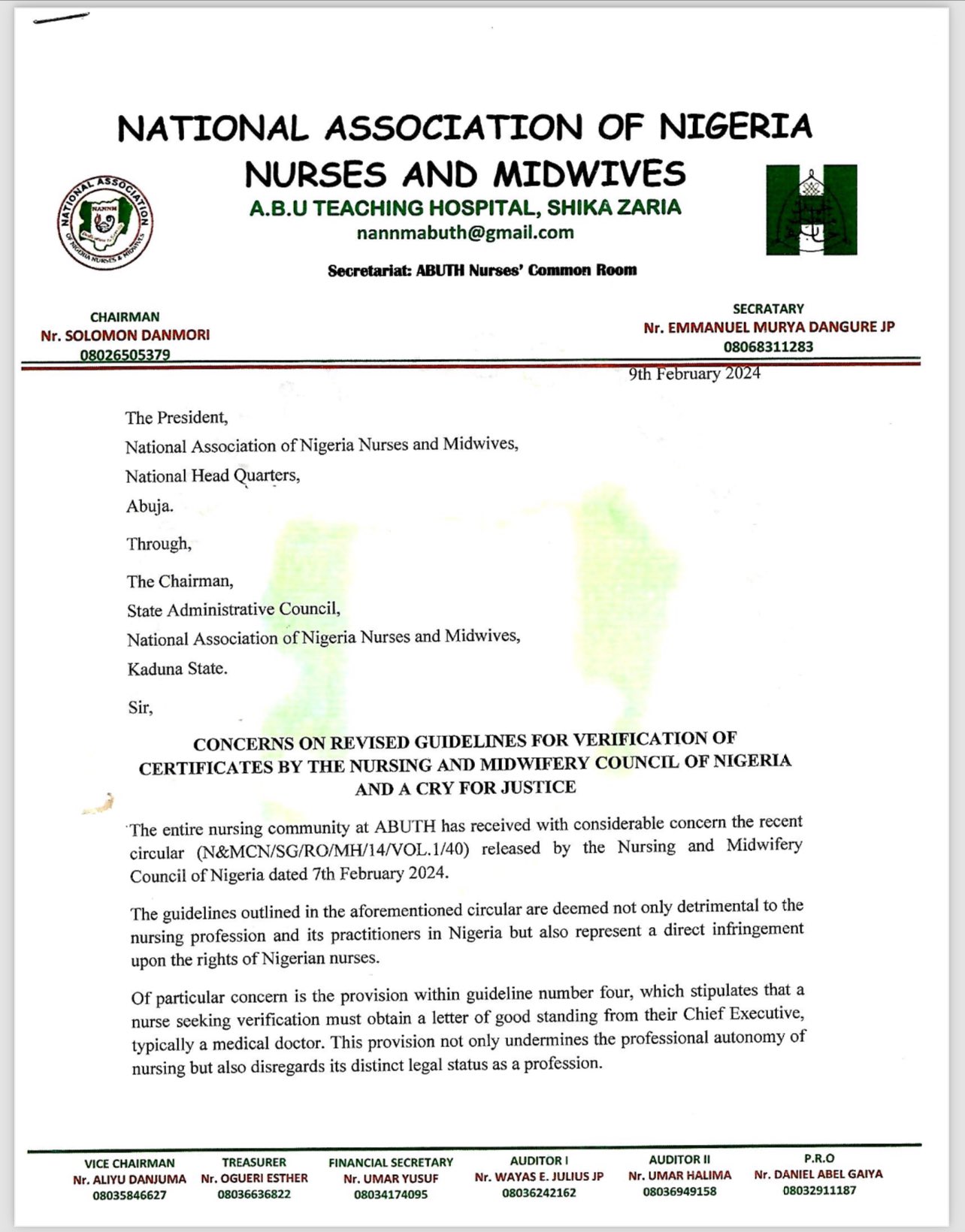 The National Association of Nigeria Nurses and Midwives, in Ahmadu Bello University Teaching Hospital (ABUTH) Zaria, has expressed concerns regarding the revised verification guidelines issued by the Nursing and Midwifery Council of Nigeria (NMCN) on February 7, 2024.