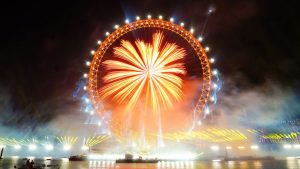 London’s celebration featured 12,000 fireworks, 600 drones, and 430 lights in a nearly 15-minute display around the London Eye on the Thames. Voice recordings from prominent figures accompanied the spectacle.